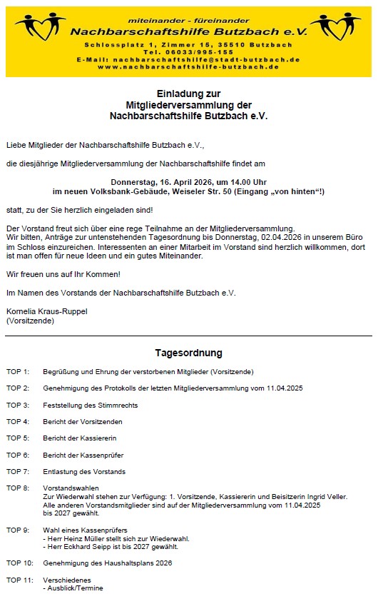 Die diesjährige Mitgliederversammlung der Nachbarschaftshilfe Butzbach am Donnerstag, 16. April 2026, findet um 14 Uhr im neuen Volksbank-Gebäude, Weiseler Straße 50 statt. Der Eingang befindet sich auf der Rückseite des neuen Volksbank-Gebäudes. Der Vorstand der Nachbarschaftshilfe freut sich auf rege Teilnahme.